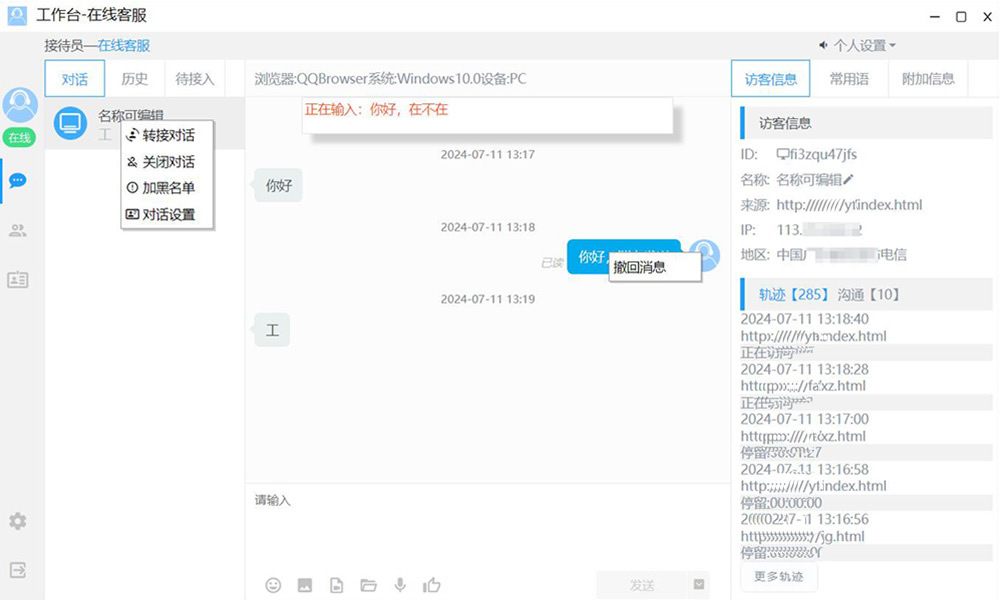 客服转接、访客信息、访客浏览轨迹、消息已读未读、机器人、消息撤回等功能